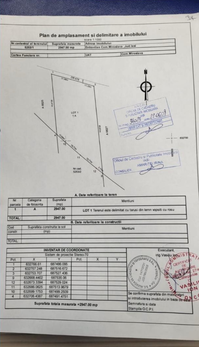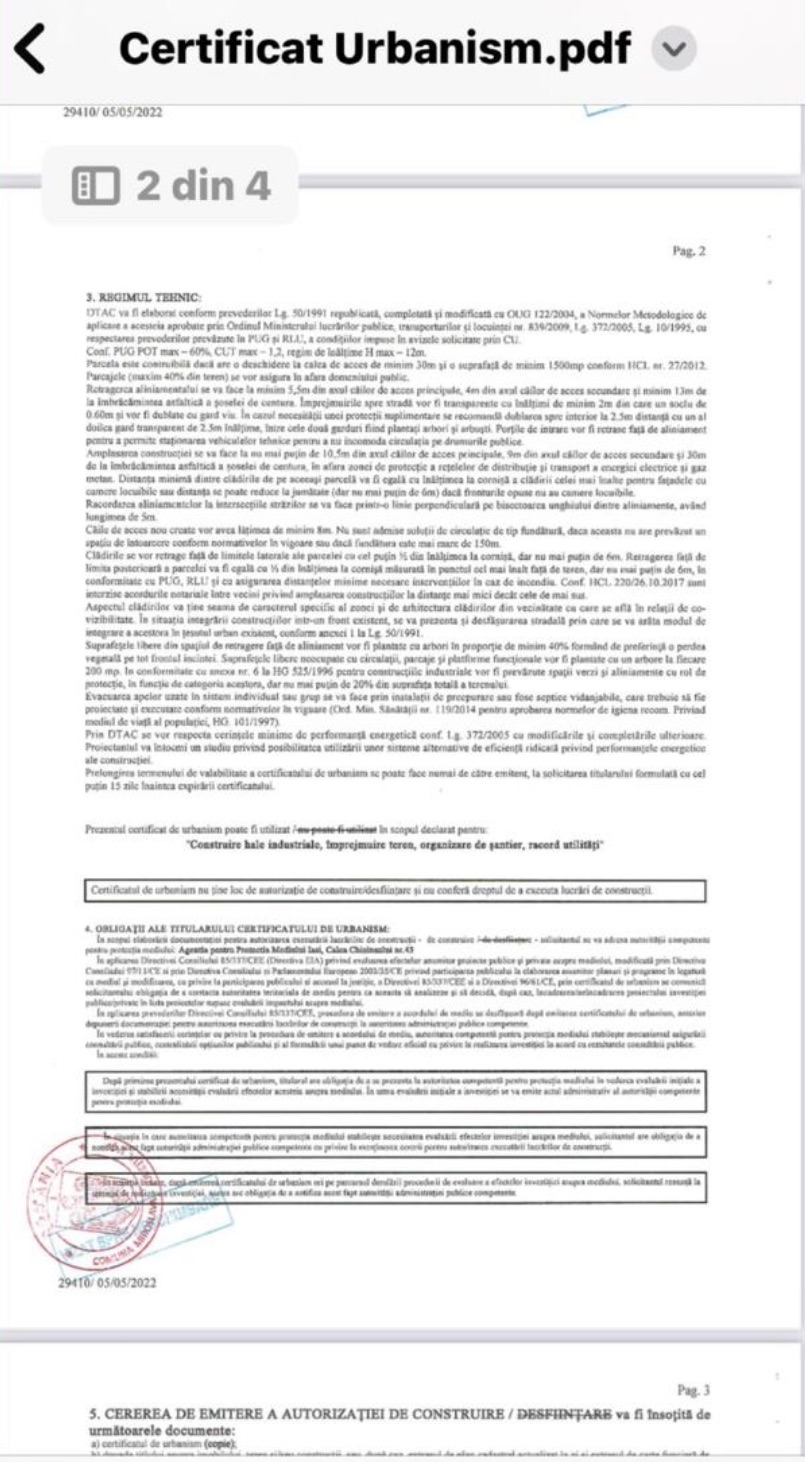 Descriere – Vând teren 3.000 mp, intravilan Uricani, la 200m de Parcul Industrial Miroslava, exact vis a vis de Casa Cu Pietre, la strada-centura, cu un front stradal de 60m; intrare directã de pe centură, fără a avea obligativitatea de a face o bretea auto de acces; se intinde de la podet, in dreapta,spre Miroslava, tangential cu centura, pana la stalp,iar in profunzime, pana la canal; certificat urbanism (POT-60%;H-12m;se poate costrui doar cu o amprenta la sol de 1.000mp, din cauza liniilor de curent care urmeaza sa fie scoase), în apropierea Metro, a drumului european E58 si a căii ferate. Toate utilitatile sunt in zona.Perfect pentru sediu firma,hala,productie, depozit, service auto, farma, constructii, transport, parcare tiruri, dezvoltare industriala. Vanzarea se poate face si in rate (50%-avans+ 12 rate).În acest caz, toate taxele notariale si impozitul aferent ii revin clientului.