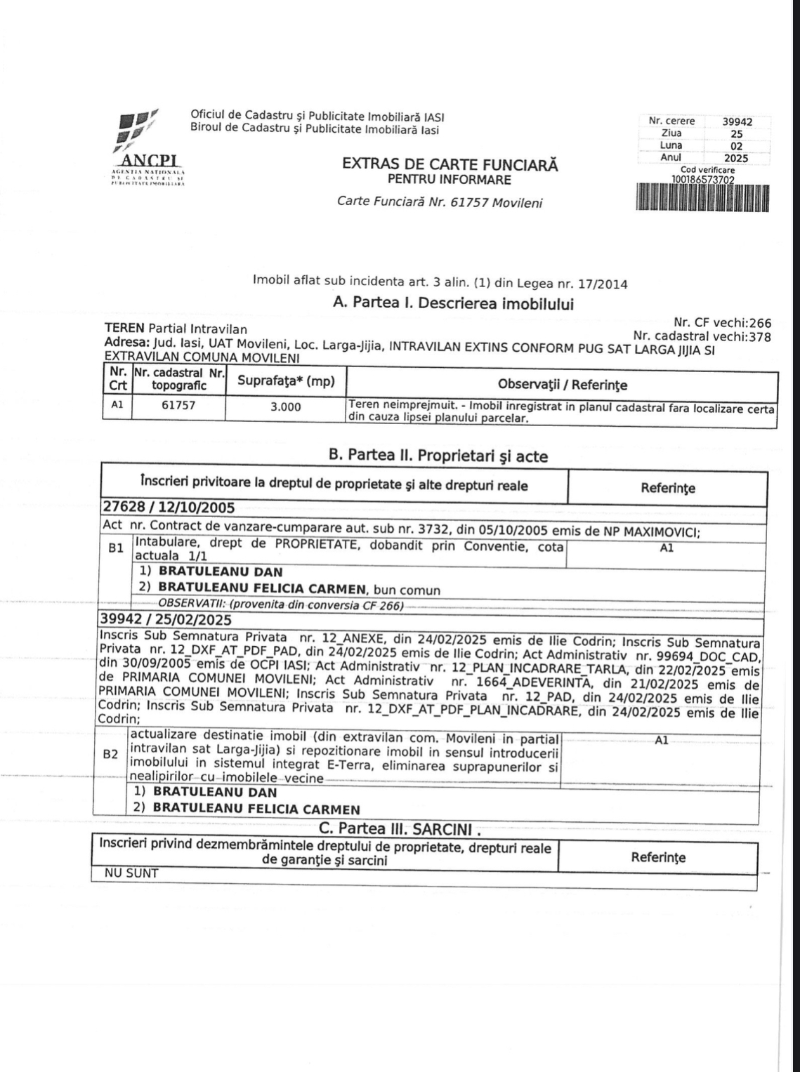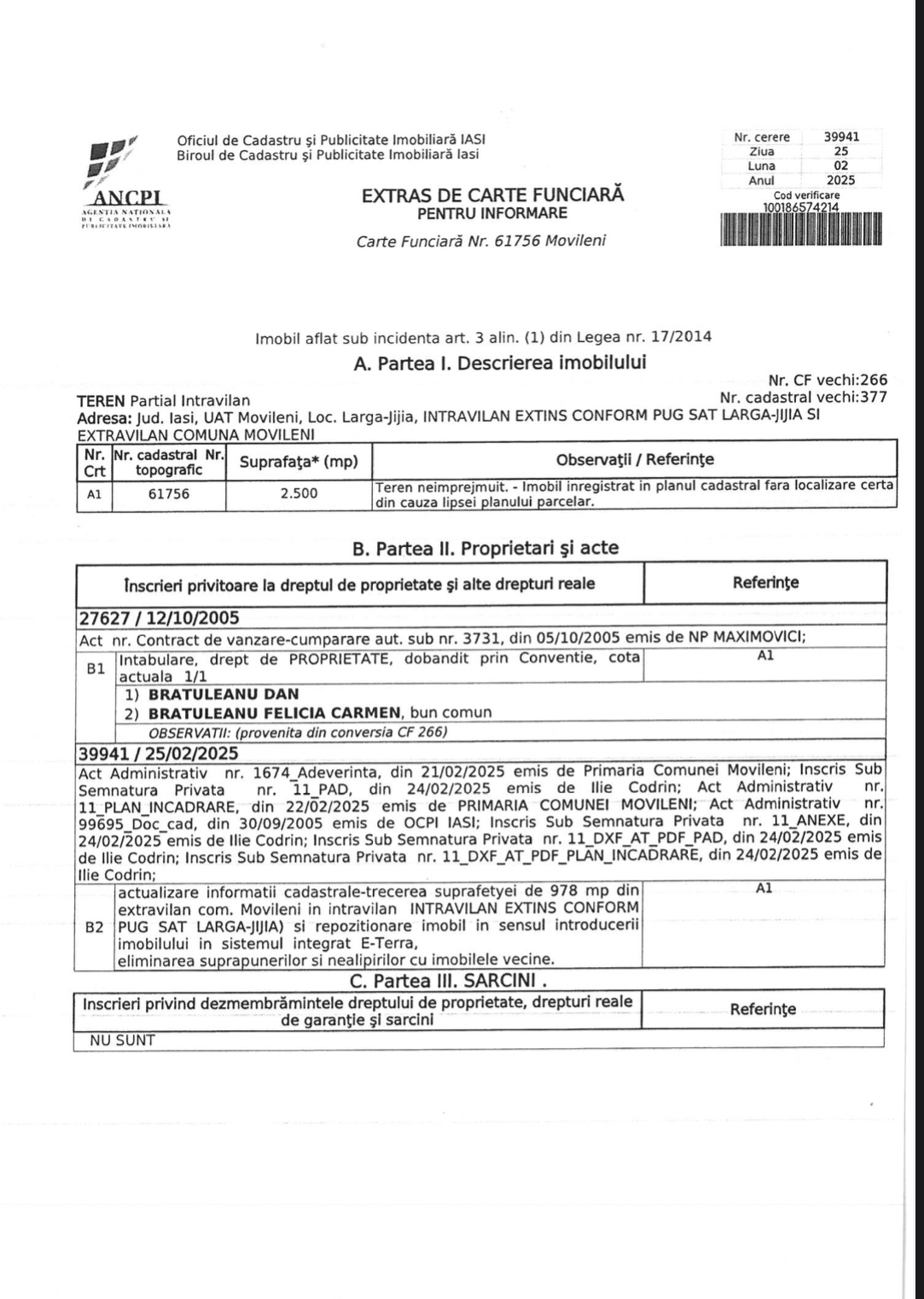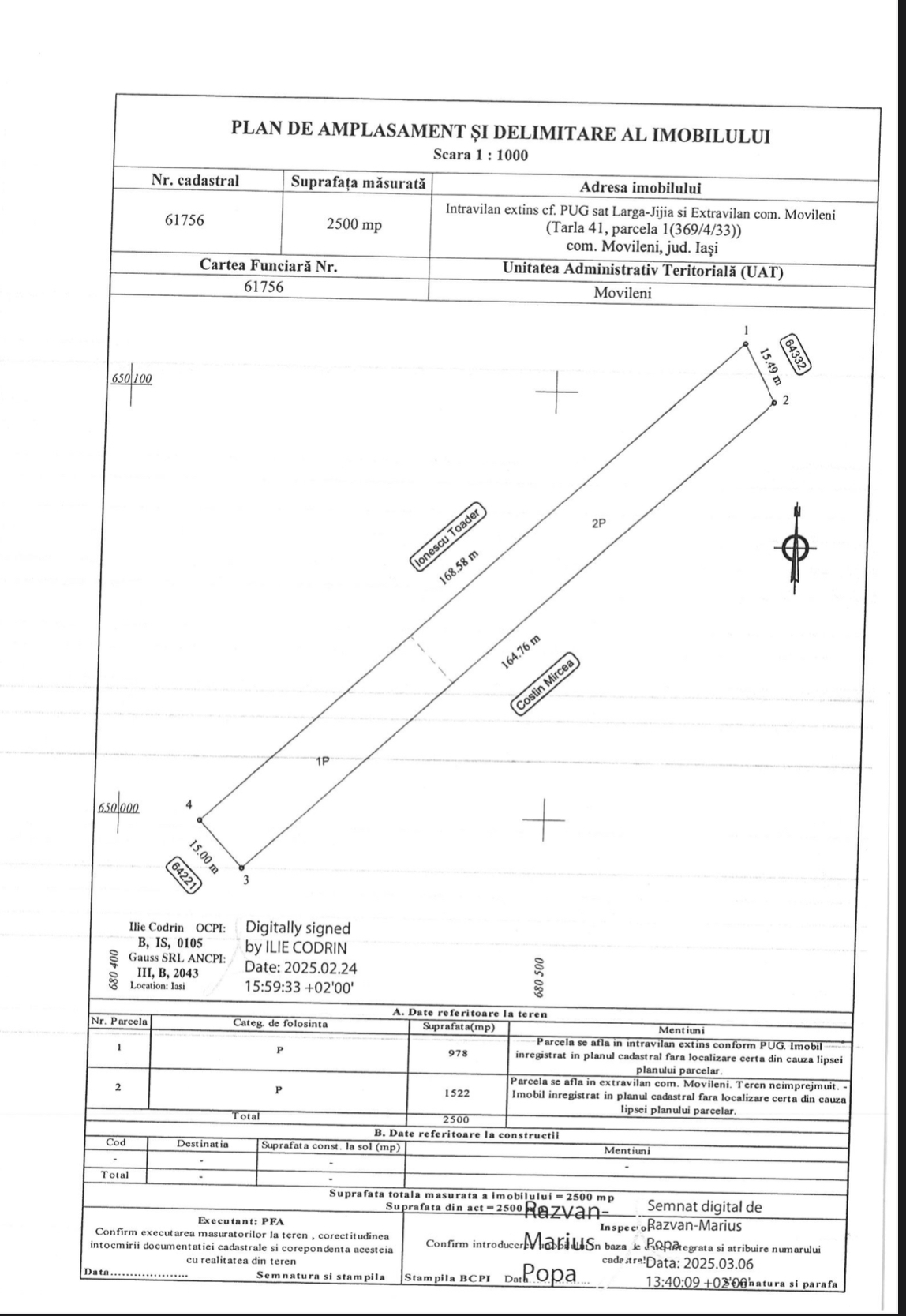Descriere – Vând 2 parcele 3000 + 2500mp impreuna sau separat. 30m deschide la asfalt, avand 2000mp intravilani(978 + 995mp) în partea frontală a proprietății, conform schiță. Capătul terenului se învecinează cu calea ferată. Prin acel capăt trece și un pârâu afluent Jijiei care este mai mereu secat.